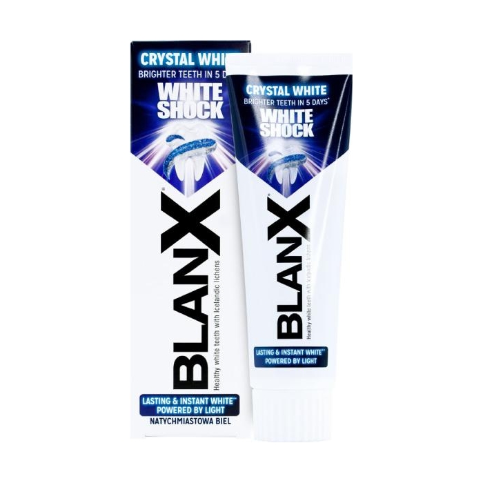 Formuła BlanX White Shock naturalnie wybiela bez użycia rozjaśniaczy optycznych i jest bezpieczna dla dziąseł, gdyż nie zawiera nadtlenku.