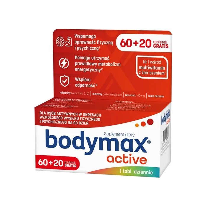 Wodorotlenek magnezu, ekstrakt z korzenia żen-szenia (Panax ginseng C. A. Meyer) standaryzowany na zaw. 8% ginsenozydów, substancje wypełniające (celuloza mikrokrystaliczna, węglany magnezu), kwas L-askorbinowy, ekstrakt z białej herbaty (Camellia sinensis L.), maltodekstryna, skrobia kukurydziana, substancje glazurujące (sole magnezowe kwasów tłuszczowych, hydroksypropylometyloceluloza, polidekstroza, szelak, wosk carnauba), drożdże wzbogacone w selen, octan DL-alfa-tokoferylu, amid kwasu nikotynowego, tlenek cynku, substancja utrzymująca wilgoć (glicerol), D-pantotenian wapnia, siarczan miedzi (II), barwnik (tlenki i wodorotlenki żelaza), chlorowodorek pirydoksyny, ryboflawina, monoazotan tiaminy, trójglicerydy średniołancuchowe z oleju kokosowego, kwas pteroilomonoglutaminowy, chlorek chromu (III), D-biotyna, cholekalcyferol, cyjanokobalamina.